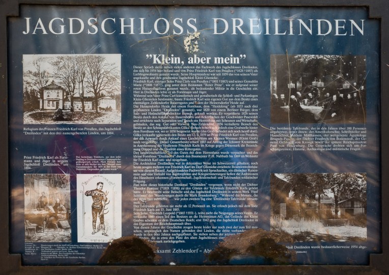 Das ⇒ Jagdschloss Dreilinden ist leider in den fünfziger Jahren abgerissen worden. An dessen Stelle befindet sich heute die Revierförsterei Dreilinden.