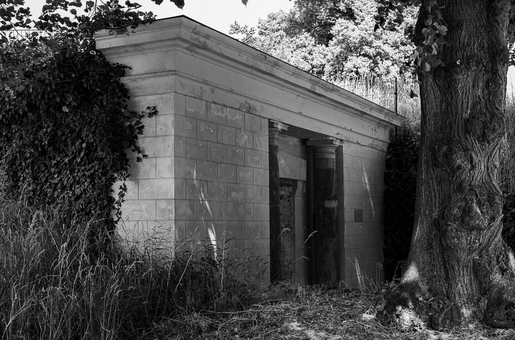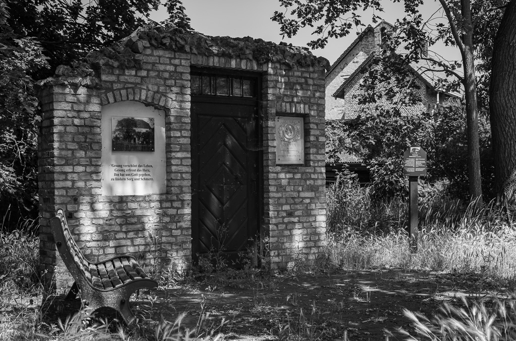 Das ist heute, knapp 200 Jahre später und nach Kriegen und DDR, nicht mehr der Fall. Wir finden jedoch das in 2005 wieder aufgebaute Erbbegräbnis der Familie etwas versteckt unter einer imposanten Linde.