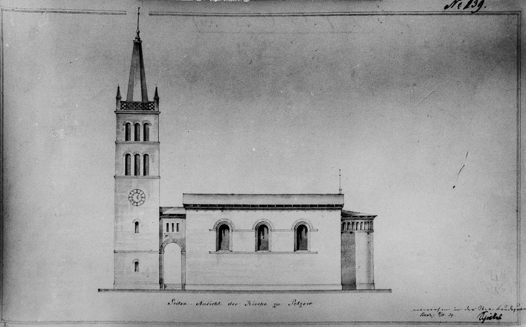 König Friedrich Wilhelm IV., das Patronat ist bei der Landesherrschaft, ordnete an, daß der Neubau im romanischen Stile erfolgen solle. Stüler entwarf die Zeichnungen; die Ausführung folgte rasch. So reihte sich denn die Petzower Kirche in den Kreis jener neuen schönen Gotteshäuser ein, mit denen der kirchliche und zugleich der feine landschaftliche Sinn des verstorbenen Königs Potsdam und die Havelufer umstellte. Wir nennen nur: Bornstädt, Sakrow, Kaputh, Werder, Glindow. Ihre Zahl ist um vieles größer.