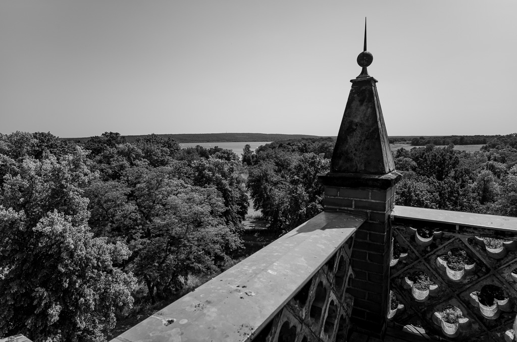Der Besuch des Turmes ist weiterhin möglich. Wir nutzen diese Gelegenheit und steigen hinauf. Das beschriebene Flachdach finden wir in etwas unerwarteter Form. Es ist zwar flach, aber zu zwei Dritteln von der Turmspitze in Anspruch genommen.