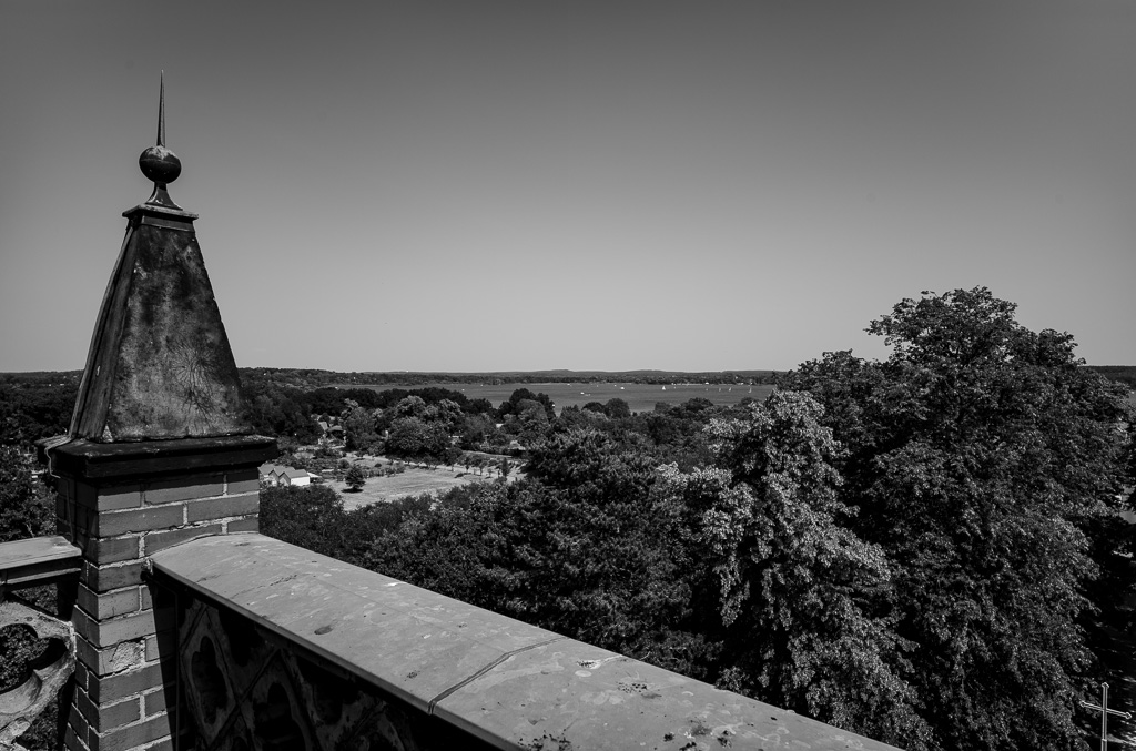 unmittelbar neben ihr der Glindower See. Die Havel und der Schwielow, durch Landzungen und Verschiebungen in zahlreiche blaue Flächen zerschnitten, tauchen in der Nähe und Ferne auf und dehnen sich bis an den Horizont, wo sie mit dem Blau des Himmels zusammenfließen.
