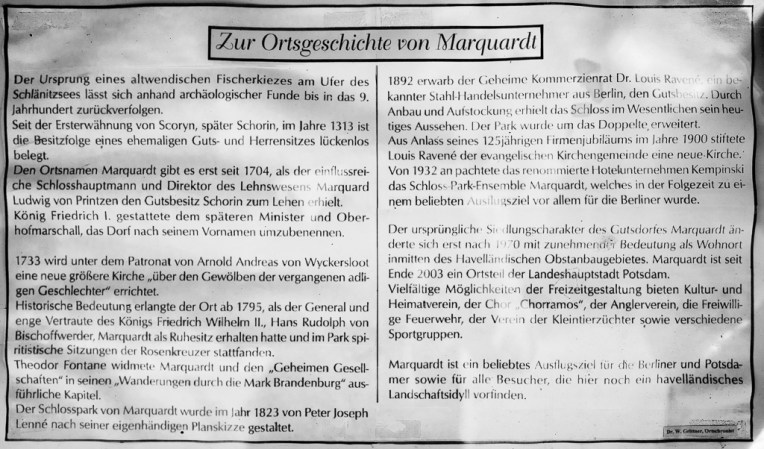 Die gegenwärtige Gestalt von Marquardt, ebenso wie sein Name, ist noch jung; in alten Zeiten hieß es Schorin. Im fünfzehnten Jahrhundert, und weiter zurück, war es im Besitz zweier Familien; die eine davon nannte sich nach dem Dorfe selbst (Zabel von Schorin 1375), die andere waren die Bammes. Der Besitz wechselte oft; die Brösickes, Hellenbrechts und Wartenbergs lösten einander ab, bis 1704 der Etatsminister und Schloßhauptmann Marquardt Ludwig von Printzen das reizende Schorin vom Könige zum Geschenk, und das Geschenk selber, dem Minister zu Ehren, den Namen Marquardt erhielt.