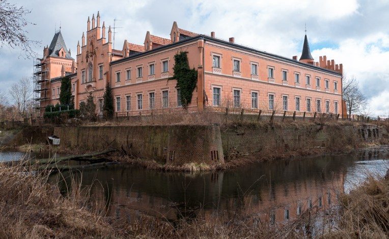 Im März 2017 ist der Park hinter dem Schloss Gusow sichtbar sich selbst überlassen.