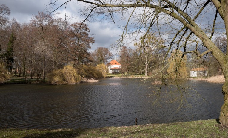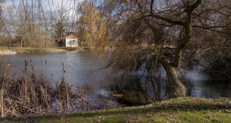 Neben der Kirche stehend finden wir genau dieses Bild wieder. Ein See, der linkerhand von Bäumen und auf der rechten Seite von Schilf gesäumt wird. Im Hintergrund das Wohngebäude mit dem Wintergarten.