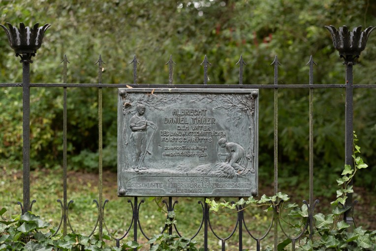 Unter ihm ruht Albrecht Thaer, und auf den Treppenstufen des Hügels, der mehr ein Blumengarten als ein Grab ist, blühen den Sommer hindurch viele hunderte von Blumen.