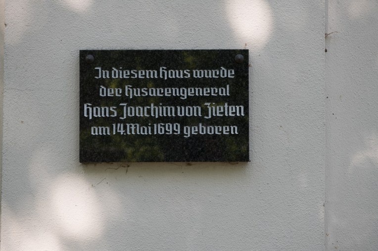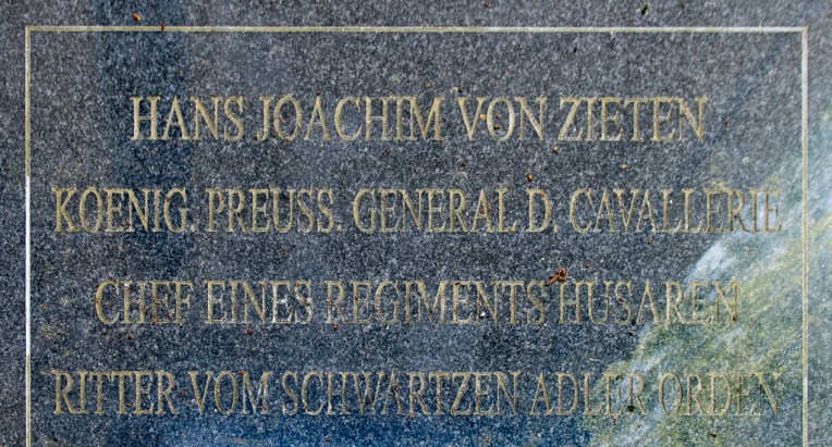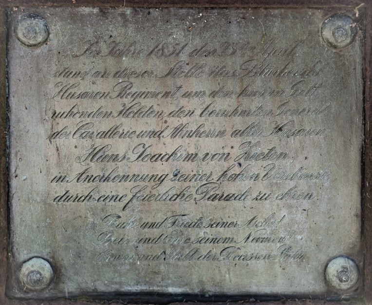 Im Jahre 1851 den 23. April stand an dieser Stelle das Blüchersche Husaren-Regiment, um den hier in Gott ruhenden Helden, den berühmten General der Cavallerie und Ahnherrn aller Husaren, Hans Joachim von Zieten, in Anerkennung seiner hohen Verdienste durch eine feierliche Parade zu ehren. Ruhe und Friede seiner Asche! Preis und Ehre seinem Namen! Er war und bleibt der Preußen Stolz.