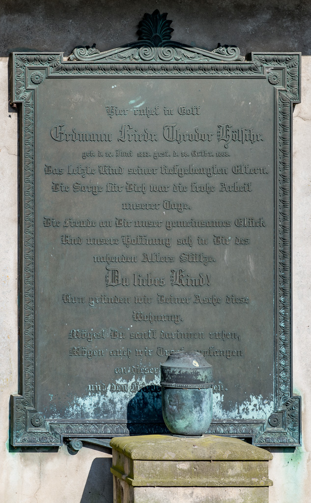 Stütze. Du liebes Kind, nun gründen wir Deiner Asche diese Wohnung. Mögest Du sanft darinnen ruhn, mögen auch wir Trost empfangen an dieser Stätte und den Frieden auf Erden.«