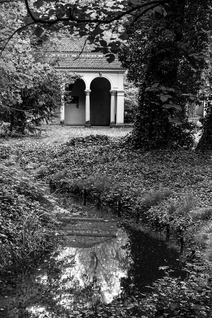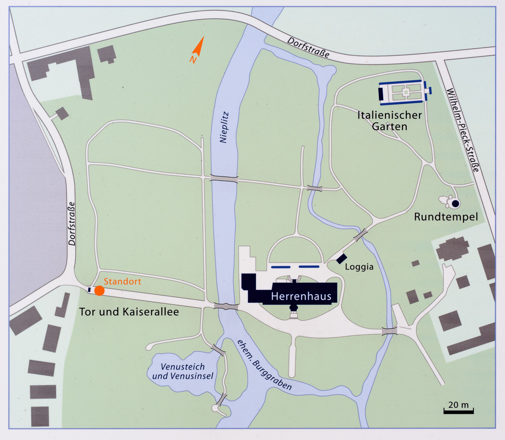 In Front ein Elsenbruch, an den Flügeln zwei breite Seespiegel, und zwischen Schloß und Park ein Wasserlauf, der diese beiden Seeflächen verbindet, – das ist in großen Zügen die Szenerie.
