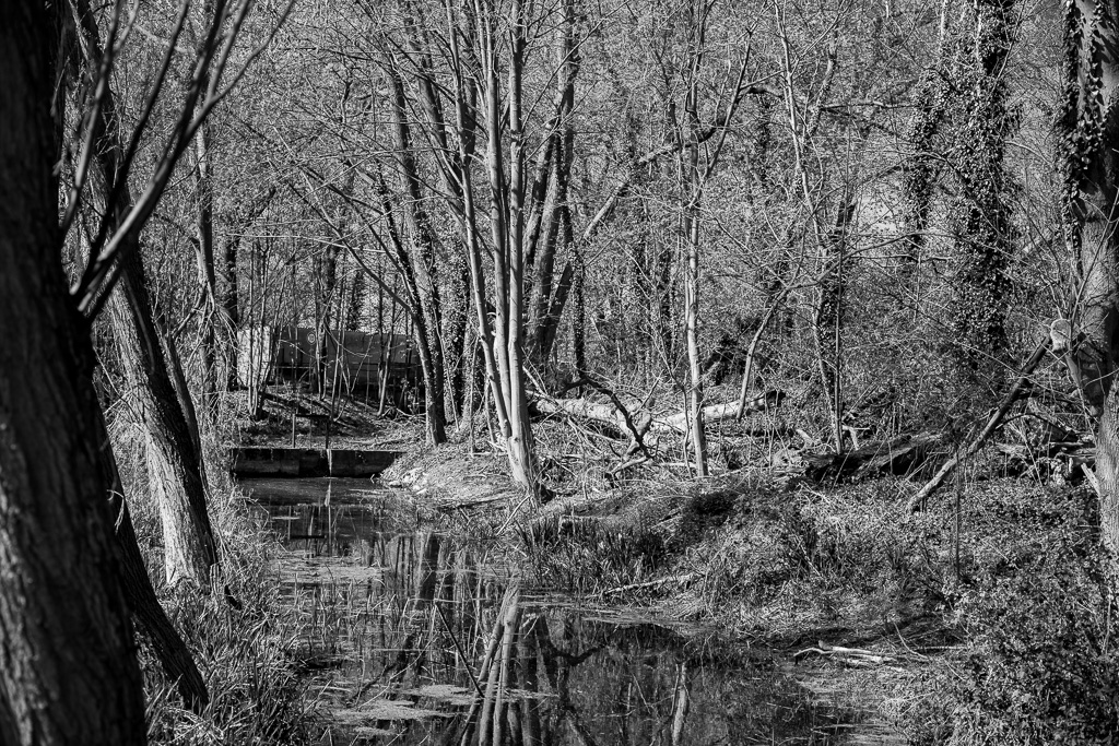 Den braucht es heute nicht mehr. Auf der Seite zum Ort ist der Graben verlandet und man könnte durch den Efeuteppich auf das vormalige Inselchen gehen.